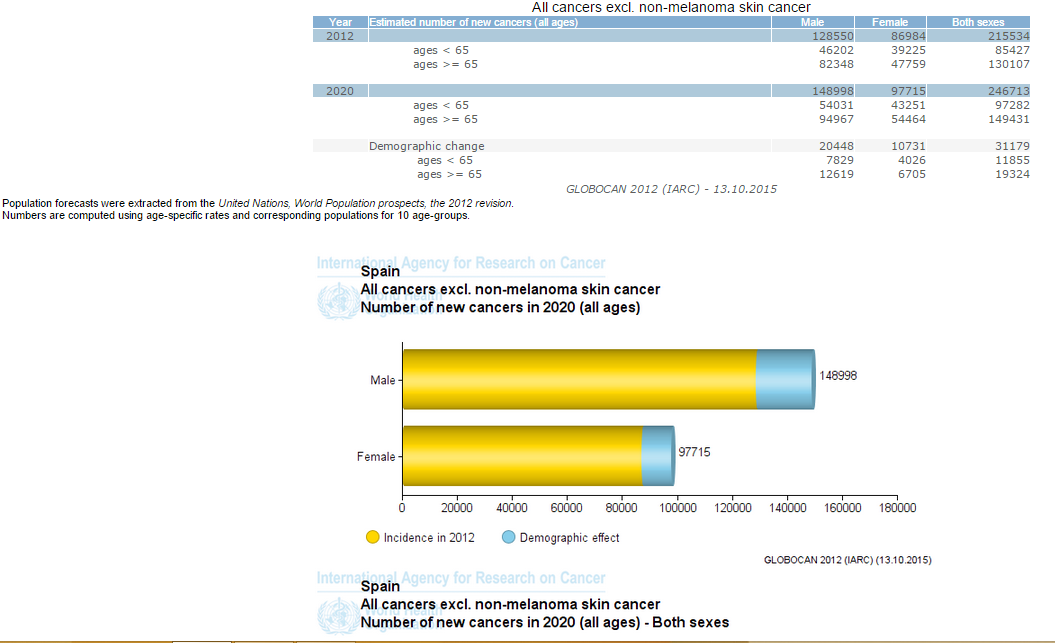 Reunamos Datos: En España disponemos de la Estrategia en cáncer del Sistema Nacional de Salud (Actualización Consejo Interterritorial del sistema Nacional de Salud 22 octubre 2009), que nos define marcos y referencias para la actividad de Calidad en nuestros Sistemas de Salud. Pero consultando los datos de incidencia de cáncer previstos para España en 2020 (según la estimación en Globocan, que es un modelo predictivo de la International Agency for Research on Cancer (IARC), este martes 13 de octubre puedes comprobar que en hombres de edad igual o mayor a 65 habrá doble incidencia que en mujeres españolas en 2020. Sin entrar de lleno en la interpretación de que nuestra sociedad española vive más tiempo, o que se diagnostica más hay mejor terapia oncológica y, por tanto, hay más supervivencia, el cáncer va a ser un escenario mucho más común en tiempos futuros. No sólo en cáncer de mama, como en estos días tratamos de polinizar en las Redes Sociales y Prensa.
