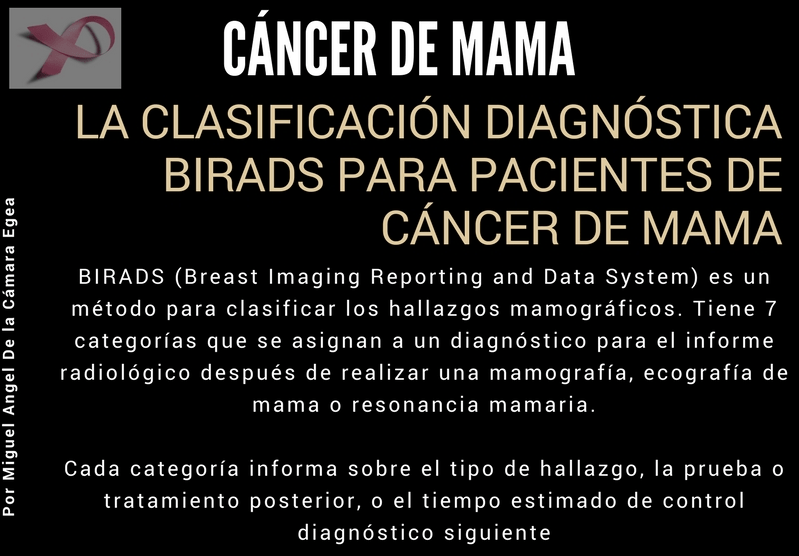 BIRADS (Breast Imaging Reporting and Data System) es un método para clasificar los hallazgos mamográficos. Tiene 7 categorías que se asignan a un diagnóstico para el informe radiológico después de realizar una mamografía, ecografía de mama o resonancia mamaria.